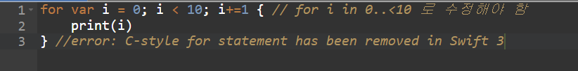 Swift 3 버전에서 C-style 이 없어져서 오류가 난다 수정 소스 1부터 10 까지 출력 print("x == 2") else -> { // Note the block print("x is neither 1 nor 2") } } Rust: Rust의 match 구문은 Swift의 switch 구문과 유사하며, 각 case가 자동으로 break됩니다. rust let number = Some(7); match number { Some(i) if i % 2 == 0 => println!("Even"), Some(i) => println!("Od..