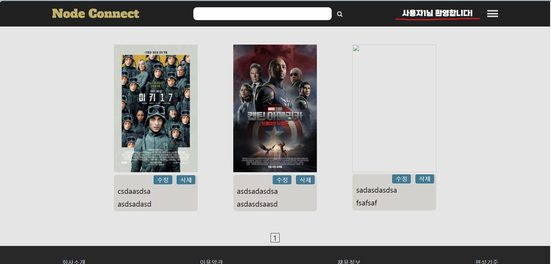 안녕하세요~ 자바스립트를 마치면서 자바스크립트와 HTML,CSS를 활용한 영화 추천 웹 사이트 프로젝트를 제작하였습니다. 📑목차1. 프로젝트 소개1-1. 프로젝트 구조1-2. 프로젝트 코드1-2. 구동 화면서론 프로젝트를 개발하기 전 로그인페이지, 회원가입 페이지, 메인페이지, 상세 페이지, 문의 페이지, 마이페이지로 나눠서 개발하게 되었습니다. 저는 로그인, 회원가입, 마이페이지 담당을 맡게 되었습니다. 회원가입을 할 때 저장되는 데이터들은 로컬스토리지에 저장을 하였고, 로그인 할때는 로컬 스토리지에 저장된 데이터들을 불러와서 쿠키의 로그인 정보 즉, 사용자이름, 아이디만 저장을 하는 방식으로 구조화 하였습니다. 본론으로 넘어가시죠본론1. 프로젝트 소개저희 NodeConncet 팀은 사용자에게 영..
