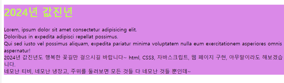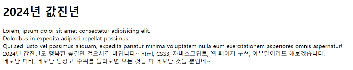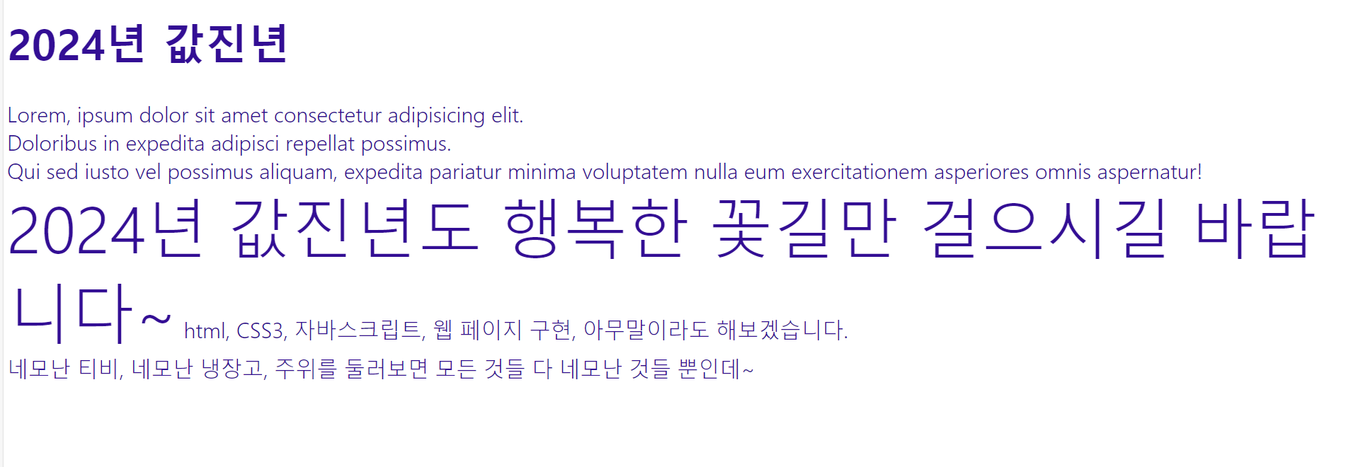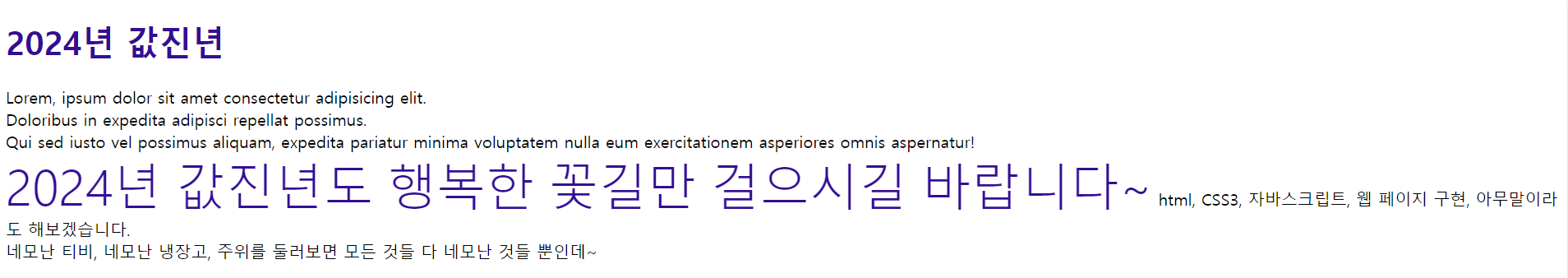 <span>2024년 값진년도 행복한 꽃길만 걸으시길 바랍니다~</span> html, CSS3, 자바스크립트, 웹 페이지 구현, 아무말이라도 해보겠습니다.</br>