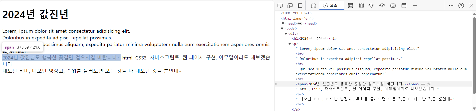 실행하면 <span> 태그로 감싸진 부분만 블록이 잡힙니다.