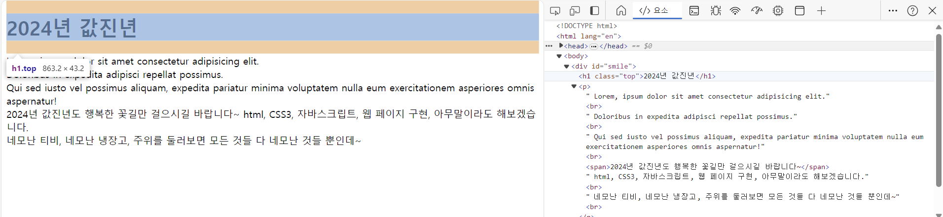 다음과 같이 컬러를 지정한 top 클래스가 적용이 되었고, 폰트 크기를 lighter 크기만큼 적용한 lighter 클래스도 적용된 것을 보실 수 있습니다.
